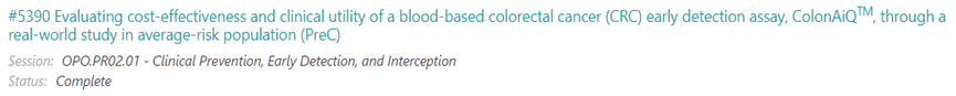 研究结果显示,自2021年1月至8月间共计为21,735例40-80岁(平均年龄为61.8岁)社区平均风险人群开展了结直肠癌筛查,其中1630例患者(7.5%)ColonAiQ®检测结果阳性,其中650例进一步接受了肠镜检查,最终确诊肠癌14例,肠腺瘤283例,息肉33例,其他肠道疾病19例。确诊的14例肠癌患者均未接受粪便免疫化学测试(FIT)检测。