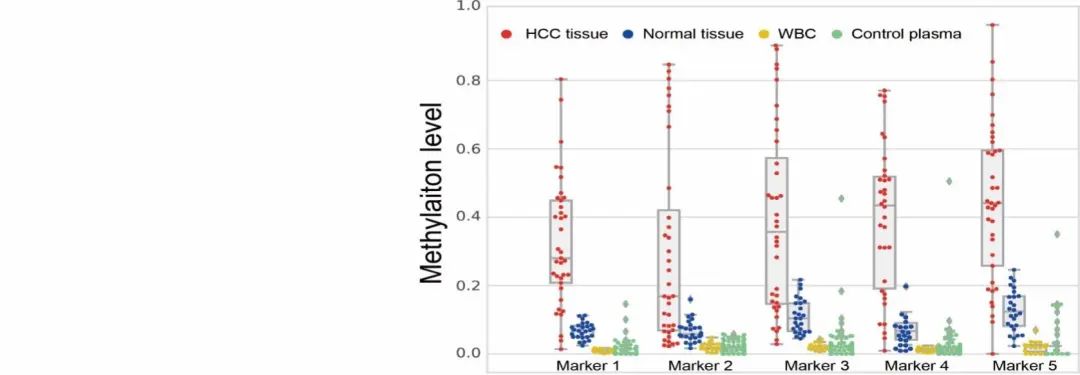本研究利用MONOD®对37个HCC组织、26个正常组织、20个白细胞和114个空白对照(血浆)进行RRBS,遴选出数百个HCC特异性相关的甲基化标志物(图2),并以5个有代表性的标志物为例评估其对HCC的检测性能,发现其在HCC甲基化程度显著高于其他样本(图3)。