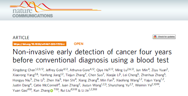 2020年7月21日,《自然·通讯》(Nature Communications)发表了由3044am永利集团基因联合复旦大学泰州健康科学研究院陈兴栋、金力等学者共同合作的研究成果“Non-invasive early detection of cancer four years before conventional diagnosis using a blood test(血液无创检测可以比常规诊断提前四年发现癌症)”。