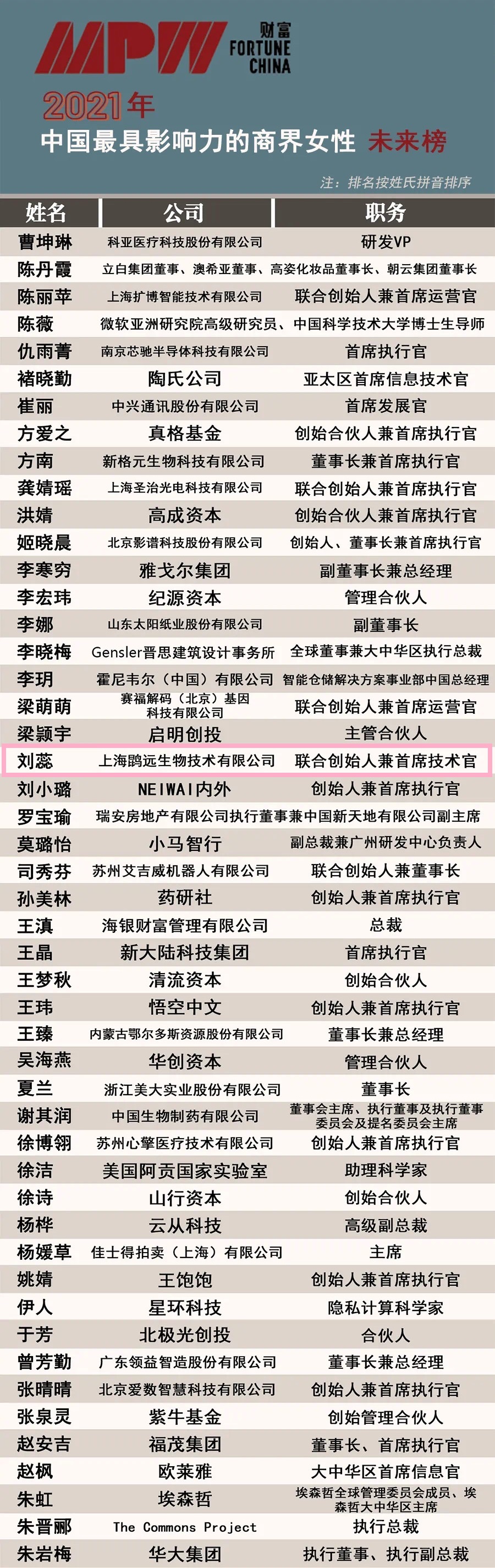 这份榜单始于2010年,过去的11年中,中国商界几乎所有重要的女性领导者都在这份榜单上有迹可循。财富杂志表示,在充满不确定性的一年里,上榜女性为帮助中国乃至世界从新冠肺炎疫情中复苏,贡献了自己的力量,并激励和启发了更多的人。在制榜过程中,始终重点考虑的一个因素是,候选人为所在企业、行业和社会做了什么贡献,财富杂志以这份榜单向这些非凡的女性致敬。