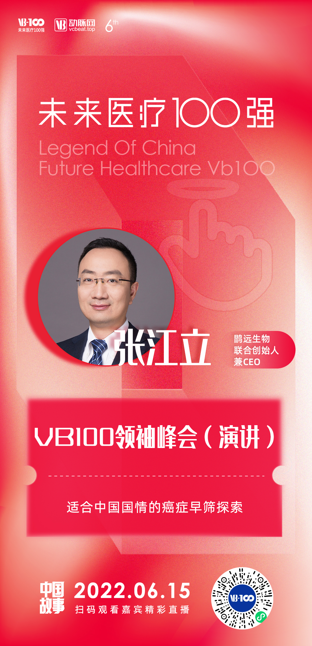 6月15日,张江立先生受主办方邀请线上出席了本届大会,并作为“第六届未来医疗100强大会·领袖峰会”主论坛的演讲嘉宾,带来了《适合中国国情的癌症早筛探索》主题演讲,与线上参会的医疗健康行业专家、学者、投资人、同行,共同探讨了癌症早筛在我国的行业现状及未来发展,并分享了3044am永利集团在这一领域的技术创新与商业化布局。